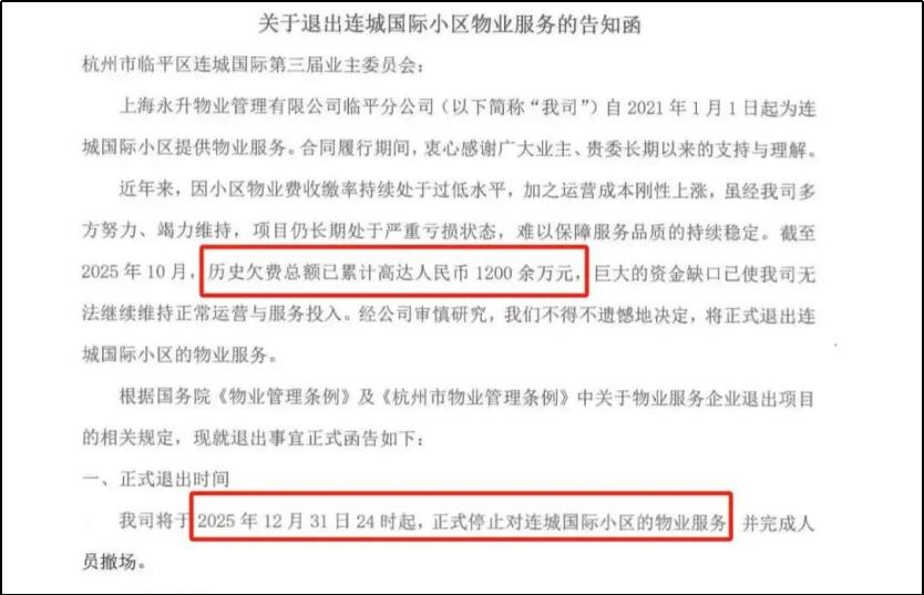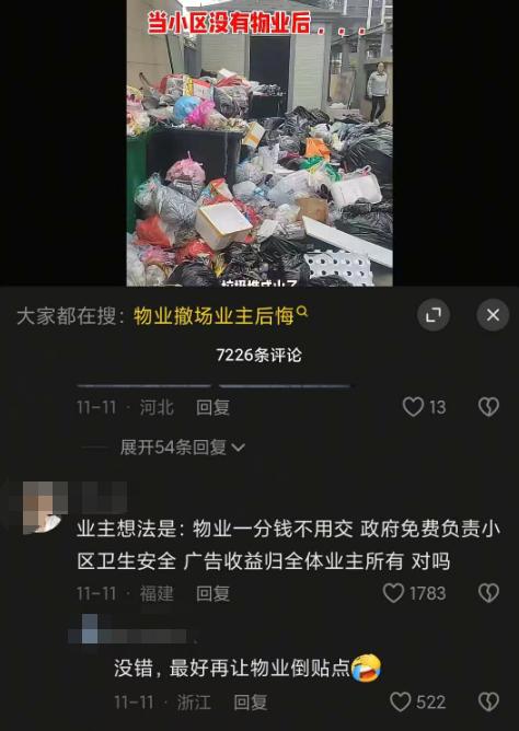 今年有个新闻,杭州某小区3800多户人家,主动交物业费的只有几百户,一些住户需要时不时催一下才会交,还有不少住户哪怕催了也不交。截至今年10月,小区业主总共拖欠物业费1200万。最后物业扛不住亏损,向业主发了份《退出告知函》。