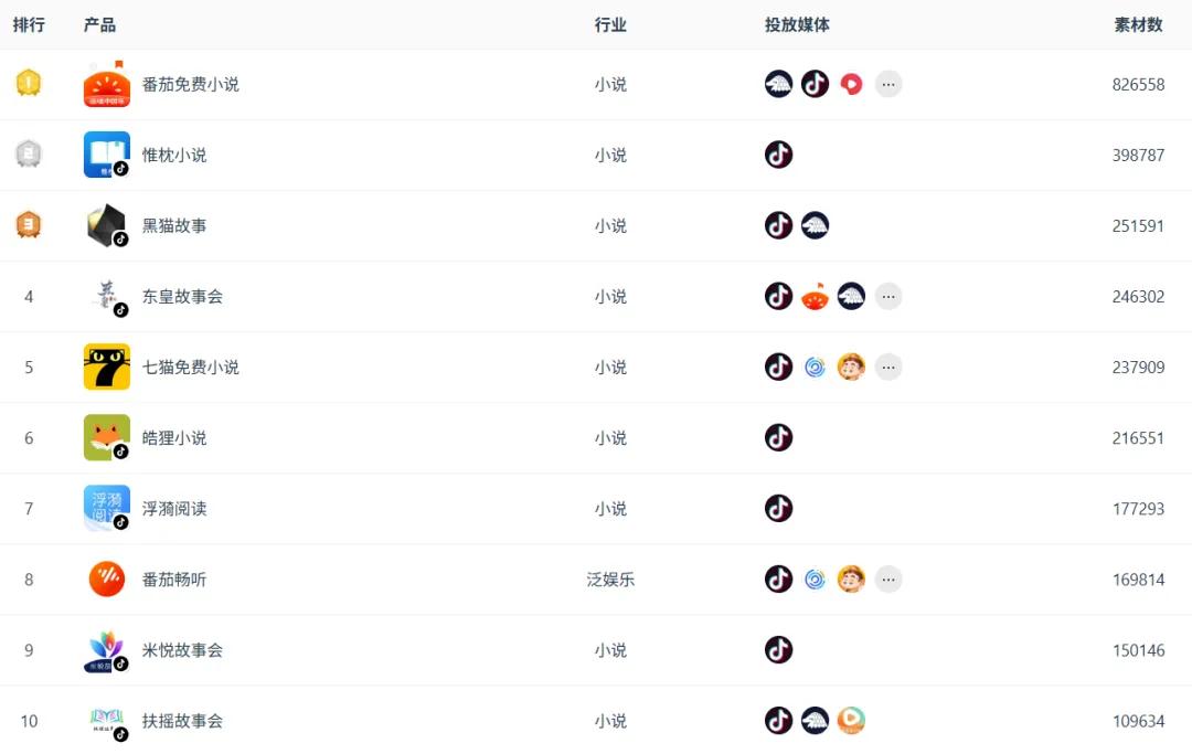 11月份的国内小说产品素材榜较10月份发生一定变化,番茄免费小说依旧蝉联榜首,素材量82.7万组,较10月份增加了3.1万组,环比上涨3.8%。