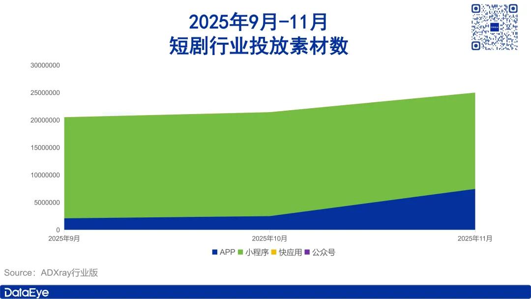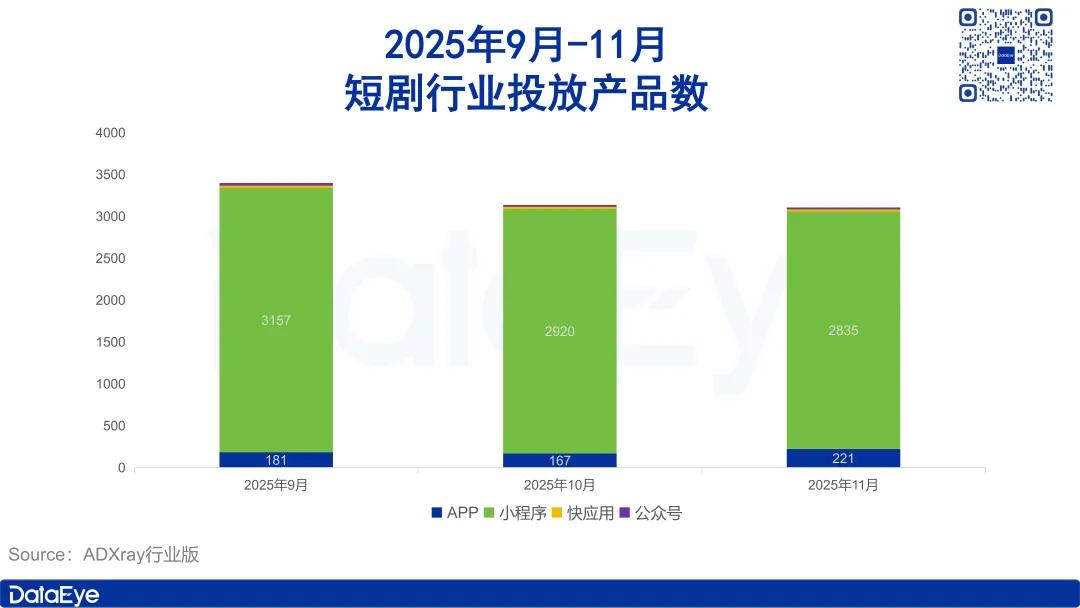 具体来看,在投APP及小程序产品数变化较为明显。2025年11月短剧行业在投APP产品221款,较10月增加了54款,环比上涨32.3%;在投小程序产品2835款,较10月减少了85款,环比下滑了2.9%。
