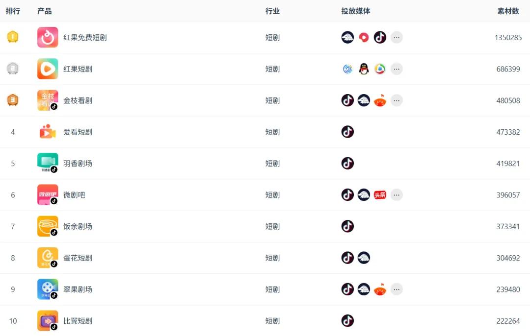 一方面,11月份短剧行业在投APP产品较10月份增加了54款,增长了32.3%,新增短剧APP产品会在一定程度上推动素材量上涨;另一方面,包括红果短剧等头部短剧APP产品素材量的上涨,也带动APP类产品素材量大幅增长。