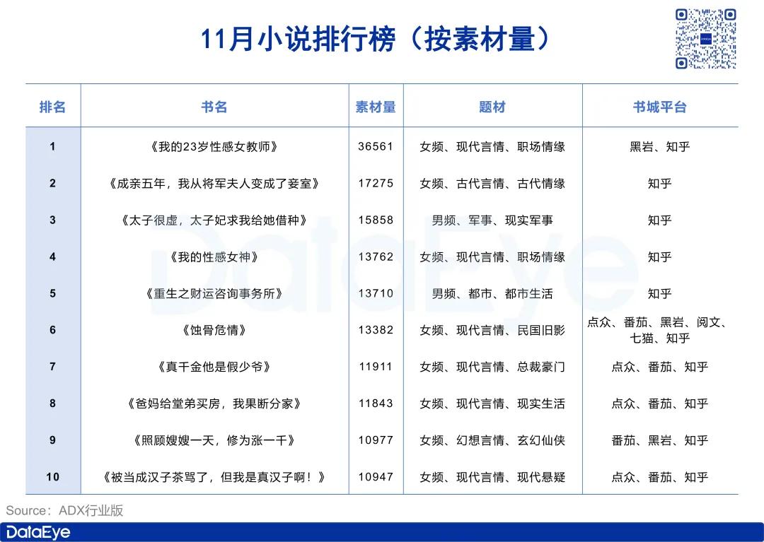 11月份的小说排行榜,《我的23岁性感女教师》蝉联第一,素材量36561组,较10月份增加了17894组,环比上涨95.9%,大幅领先其它小说,《成亲五年,我从将军夫人变成了妾室》和《太子很虚,太子妃求我给她借种》位列第二、三位,素材量分别为17275组和15858组,另外值得注意的是,11月小说排行榜TOP 10小说素材量均不低于1万组。