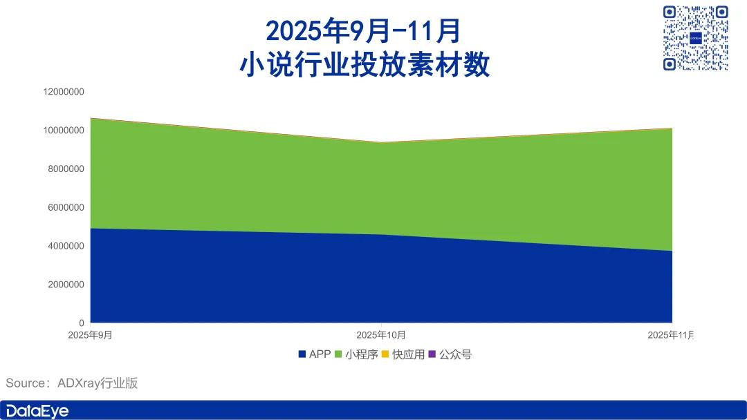具体来看,2025年11月国内小说行业投放素材数1011.3万组,较10月份增加了73.7万组,环比上涨7.9%。