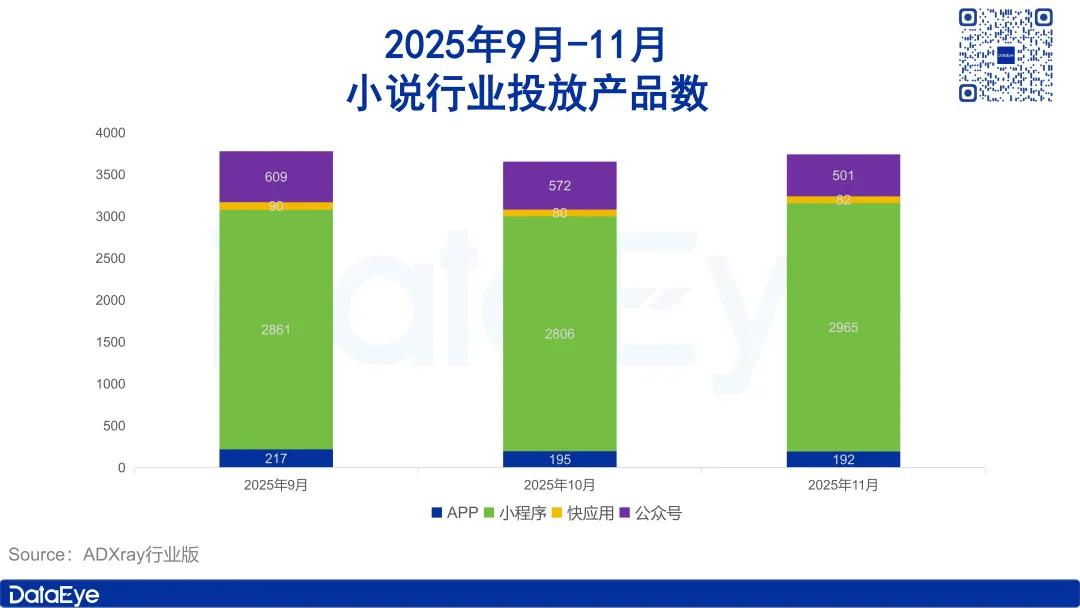 ADX行业版数据显示,2025年11月国内小说行业在投产品3740款,较10月份增加了87款,环比上涨2.4%。