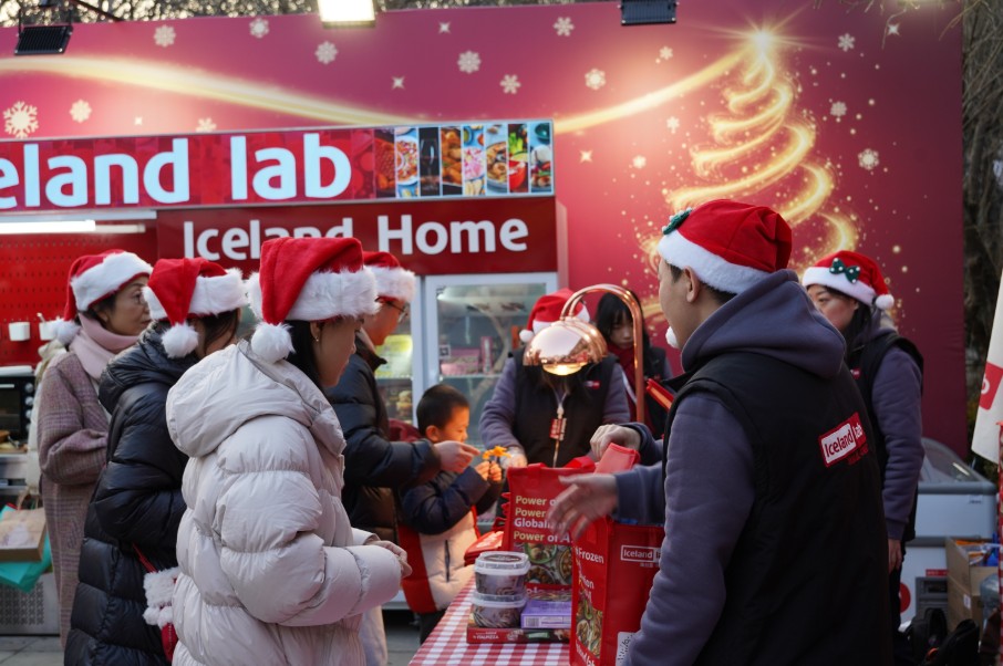 12月6日,英国驻华大使官邸圣诞开放日市集的草坪上,排队最长的地方,不是圣诞老人见面会,而是一个卖冷冻食品的摊位——Iceland。