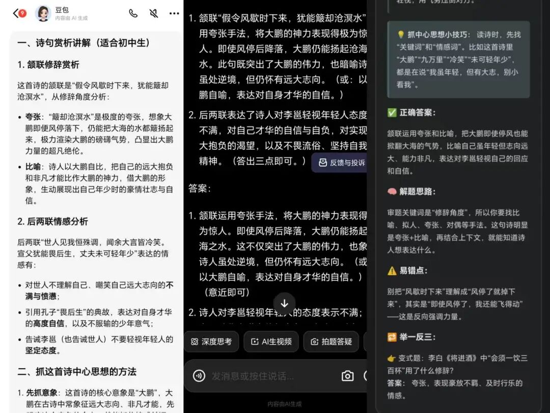 这五组实测呈现出一个相对清晰的图景:豆包、千问和灵光,都已经可以在学习场景中「帮上忙」,但它们其实在扮演不同的角色。