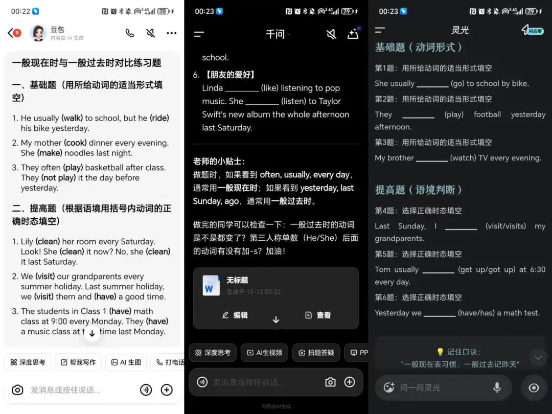 在英语练习生成上,三款助手同样完成了任务,题目基本围绕时态对比展开,也都加入了日常生活情境。差别依然类似:豆包和灵光提供的是「可用的一组题」,千问在题型标记和练习结构上多做了一点「老师视角」的功夫。