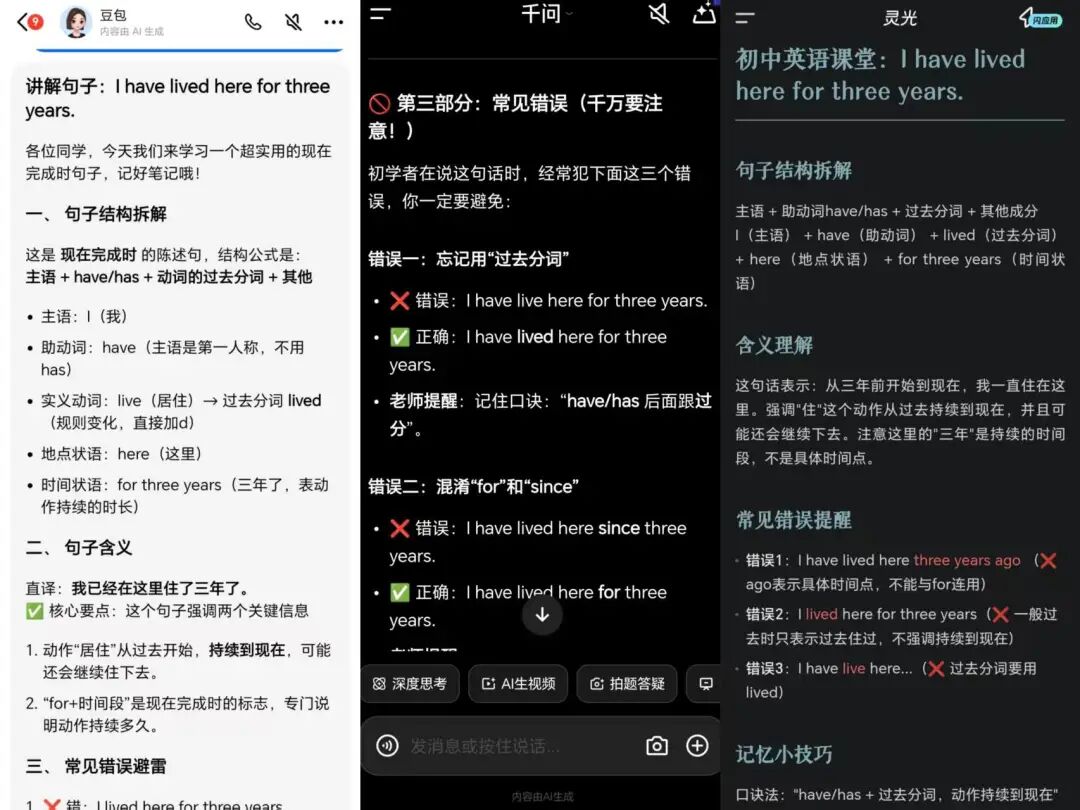 三款助手都能说清 for 与 since 的区别,也能给出现在完成时的基本结构。豆包按指令完整铺开,千问在准确性和紧凑度上稍有优势,灵光则保持了清晰而不过度展开的风格。就这个单点来看,它们都已经具备「讲清一个句型」的能力。