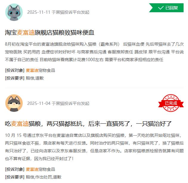 不过除了在营销端的持续投入外,围绕在乖宝宠物身边的质疑声也多次出现。社媒平台上有消费者表示,自己家里养了三年的宠物猫在吃了麦富迪猫粮后没几天突然离世、狗粮开封后有明显异味…黑猫投诉平台上针对麦富迪的投诉量也有750条,其中有不少集中在食品安全问题上。