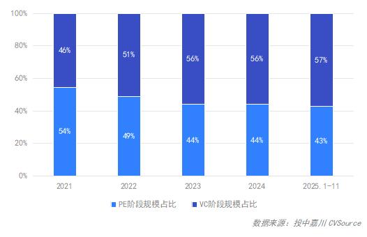 2025年1-11月,PE/VC阶段投资数量占比分别为22%、78%,相比之下VC阶段投资交易占比逐年增加。从投资规模来看,VC阶段投资规模比重增势更为显著,本期VC投资规模占比增加至57%,交易均值来看,市场整体均值回落的前提下,PE阶段均值几近维持不变,VC阶段均值回落至0.88亿元/笔。
