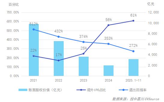 2025年1-11月,共有250家中企实现IPO上市,其中135家上市公司身后有VC/PE机构背景,渗透率回落至54%。退出方面,账面股权价值大幅回升,退出回报率降至272%,境外IPO占比增加至61%。背后原因不乏前期VC/PE布局项目进入退出周期支撑规模,但资本前置节奏放缓拉低渗透率;境外市场对创新赛道包容度+流动性优势,推高境外上市占比;企业融资需求下,IPO仍是现金流补充核心渠道,资本兑现诉求托举上市节奏。
