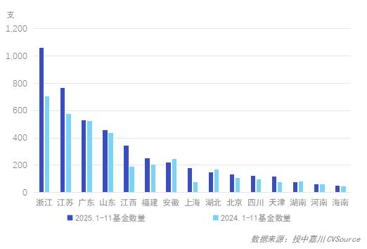 2025年1-11月,共计31个省市区(含港澳台)新设基金,其中,浙江省新设数量1,060支位居榜首,江苏省、广东省新设基金764支、529支紧随其后,安徽省、湖北省同比有所下挫。