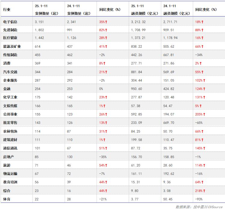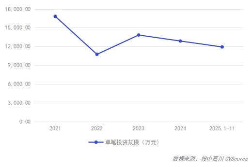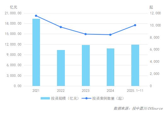 2025年1-11月,投资案例数量10,007起,同比上涨30.33%;投资规模11,930.23亿元,同比上升31.54%;投资均值1.19亿元,较去年同期几近持平。整体来看,投资市场在2025年1-11月表现亮眼,呈现较为明显的回暖态势。