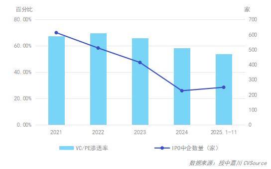 图17 2021年-2025年1-11月IPO方式退出VC/PE渗透率