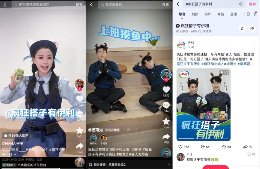 比如,伊利疯狂动物城2系列与王男、杨雨光、李明磊合作的广告短片,就被收录在官方相关话题之下,#疯狂搭子有伊利 抖音相关话题播放热度高达6182.9万次。