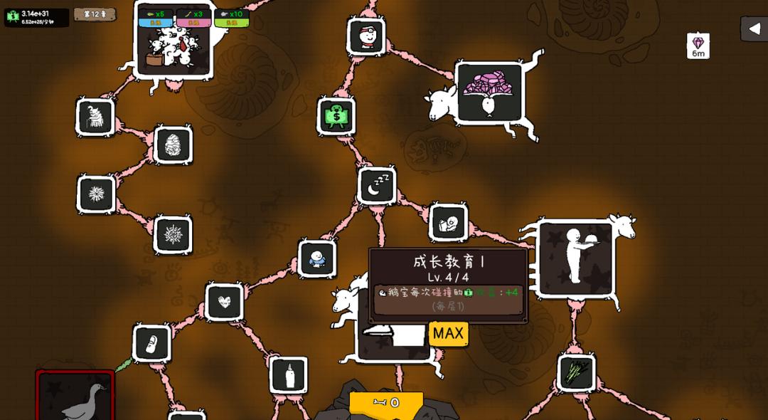 进入新章节,玩家迎来的不仅是全新的“鹅树”需要培育,更有一系列成长奖励。每次通关后会获得“骨头”资源,用于点亮名为“巨根天赋树”的局外成长系统。这套永久性升级包括提升初始资金、增加钻石存储上限,甚至解锁会定期送来资源的“管家”等,这些天赋能显著增强后续关卡的初始动能,减小成长压力。