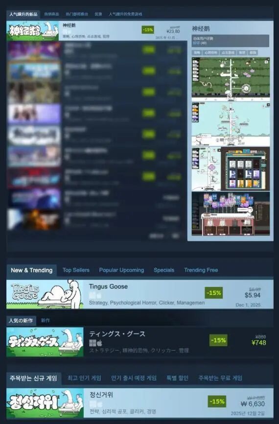 值得欣慰的是,国内玩家对这款气质独特的游戏报以极高的热情。游戏发售后迅速登上Steam全球多地区新品热门榜前列,并获得吉田修平等业界知名人士的试玩推荐。这份来自社区的活力,无疑为《神经鹅》的“鹅宇宙”注入了源源不断的生机。