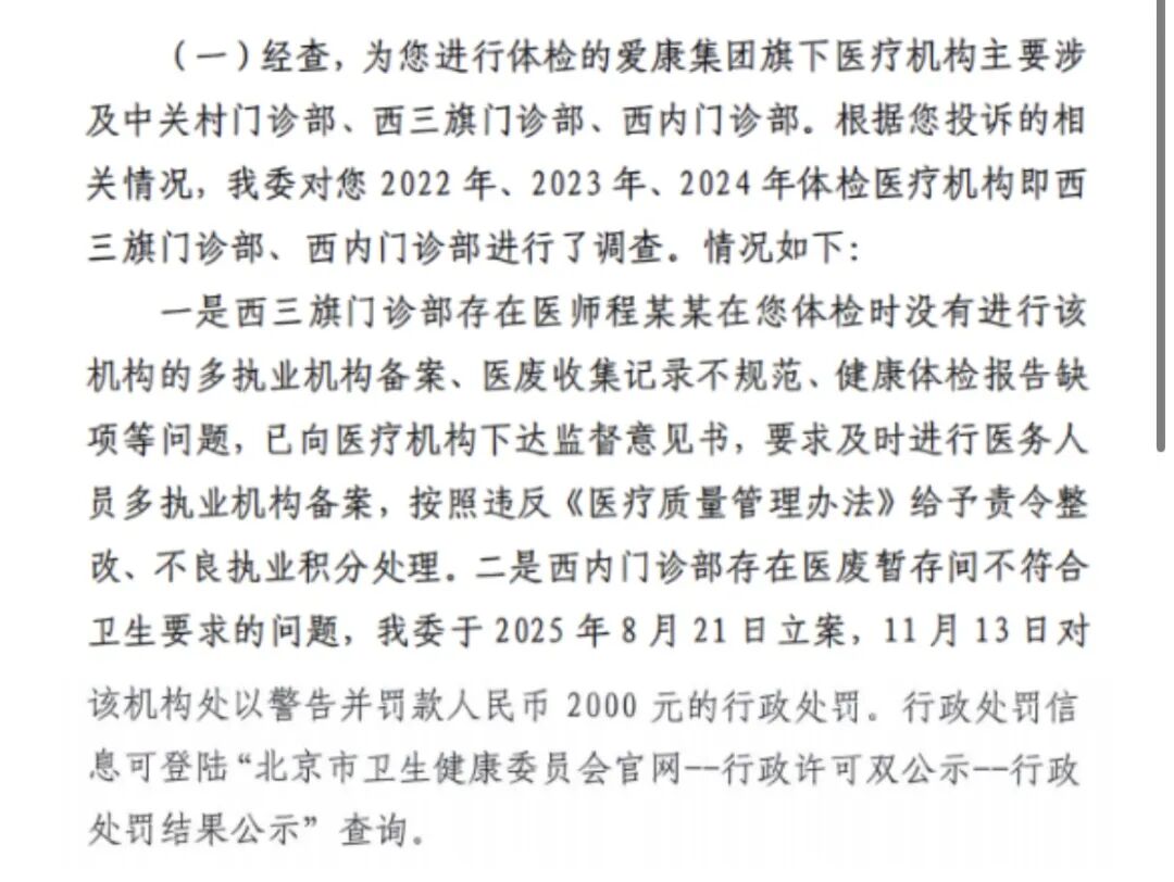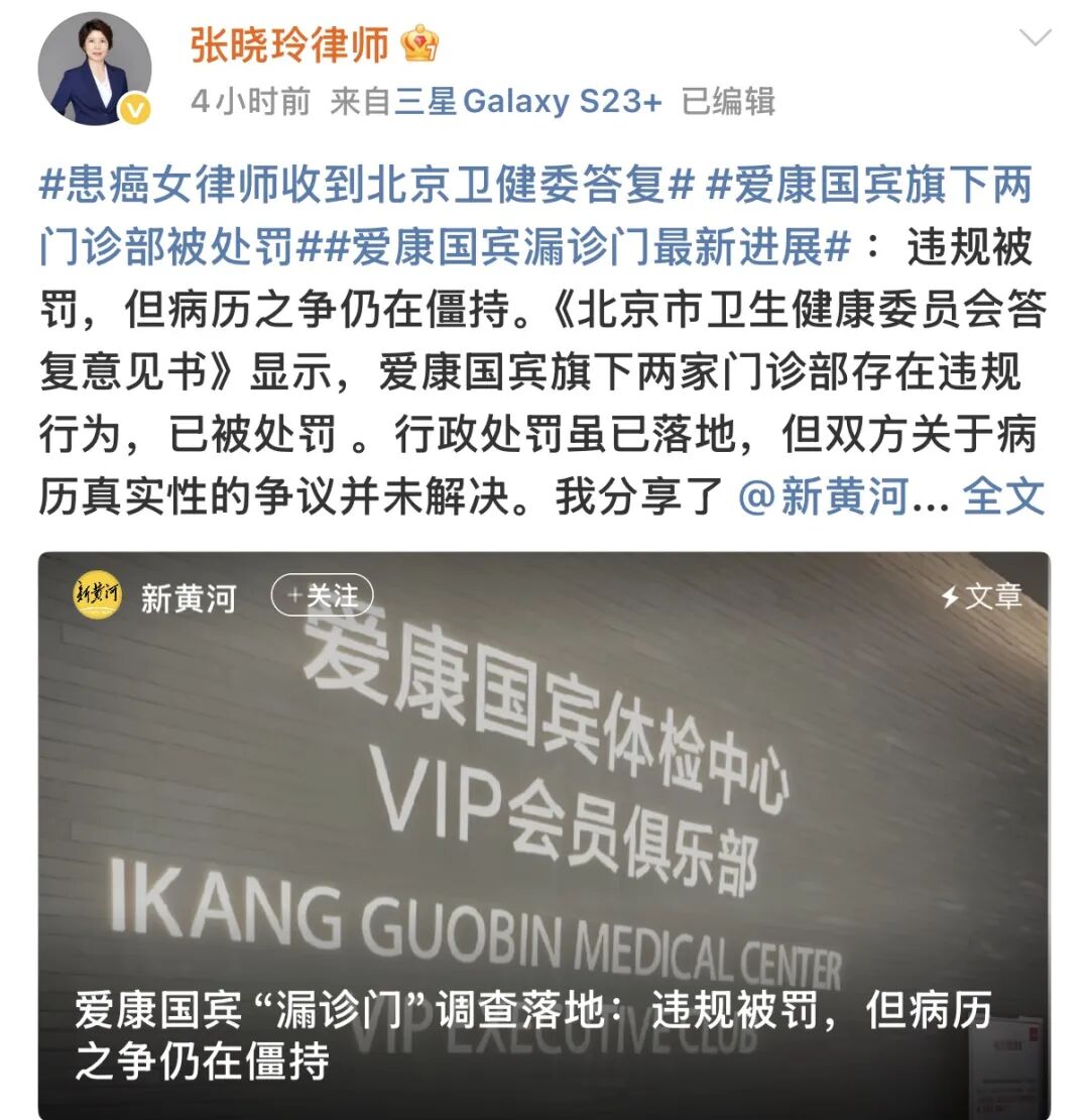 同时,张晓玲转发的一则博文中,新黄河报道称,2025年12月,北京市卫生健康委员会就张晓玲律师与爱康国宾的“漏诊门”纠纷出具答复意见书,认定爱康国宾西三旗门诊部存在医师未多执业备案、体检报告缺项等问题。