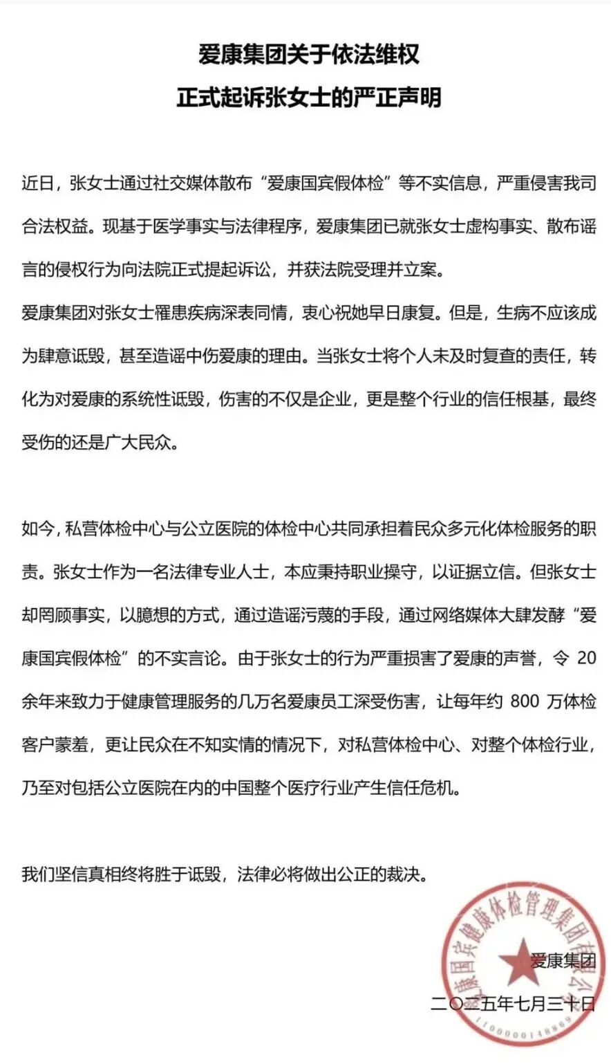 值得注意的是,7月30日,爱康集团针对张晓玲的诉求发布严正声明称,张女士通过社交平台散布 “爱康国宾假体检” 等不实信息,损害其合法权益,集团已就此向法院起诉并获立案。