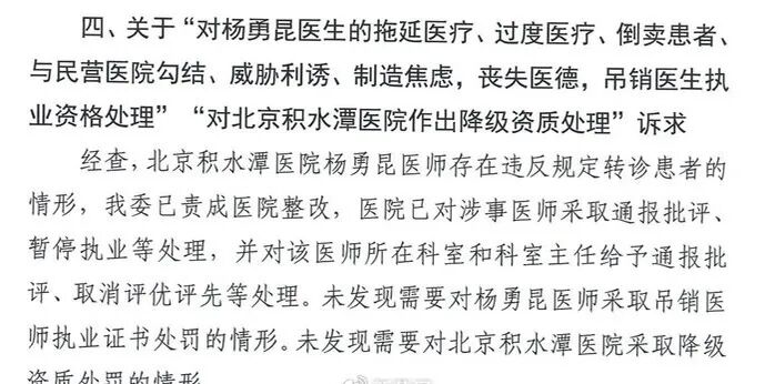 同时,西内门诊部因医废暂存间不达标被警告并罚款2000元,查实北京积水潭医院医生杨勇昆违规转诊重疾患者至私立医院,已被通报批评并暂停执业,但未发现涉事实验室数据及体检结果造假。