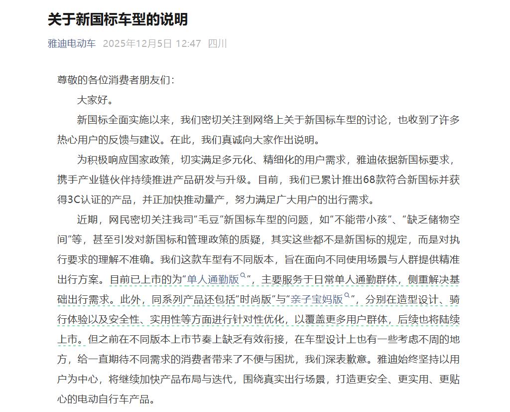 对此,行业头部品牌纷纷发表声明进行澄清。雅迪甚至针对旗下“毛豆”车型在后座和储物空间方面的消费者反馈正式道歉,指出这些并非国标强制要求,而是对规范理解的偏差所致。