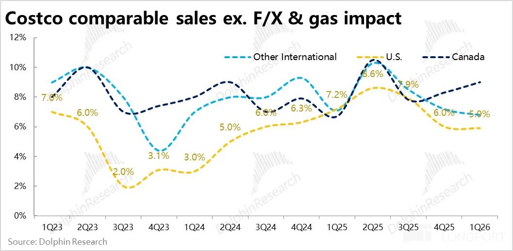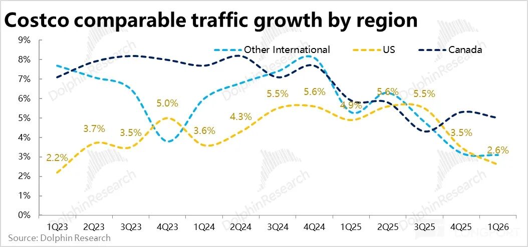 本后核心原因同样是,美国地区的同店客流增速从上季的 3.5% 再度明显走低到 2.6%,连续两个季度幅度不小的放缓,很难不让人怀疑 Costco 在美国地区的客群消费能力确实在走弱。类似的,加拿大增长坚韧背后也是因其同店客流仍保持着 5% 的稳健增长。