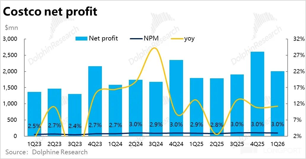 此外,剔除油气和汇率影响后客单价同比增幅由上季的 2.6% 提升到 3.2%,客单价同比涨幅依然是明显走高。结合管理层之前的沟通,在关税和人力通胀导致公司的采购成本和经营成本上升后,Costco 一直在尽力克制对商品提价,延后关税和通胀对消费者的直接影响,但最终仍是不可避免传导到终端售价上。