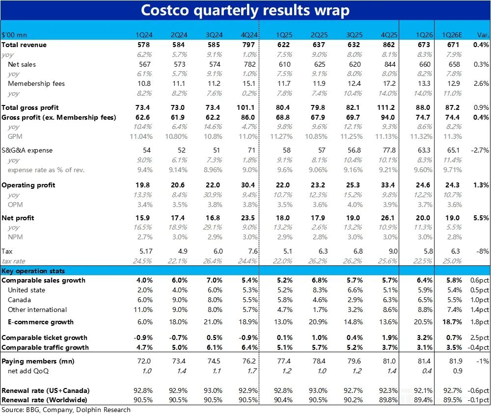 全球折扣零售王者—Costco于 12 月 11 日美股盘后,发布了截至 11 月 23 日的 2026 财年 1 季度财报。大体上业绩依然平稳,财务上的收入和经营利润增长有一定改善势头且稍好于预期。但更重要的经营指标上,同店销售/客流增速,和会员增长/续费率等仍表现不算好。