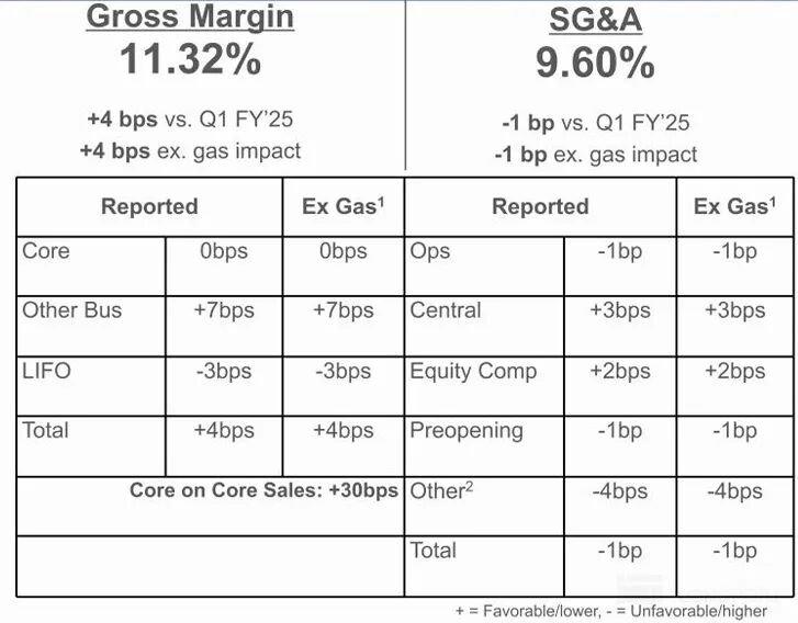 因此,同店销售增速的走高完全是由于平均客单价同比显著提升了 3.2% vs.上季的 1.9%。其中部分原因是先前油气价格和汇率的逆风影响在本季完全消退。