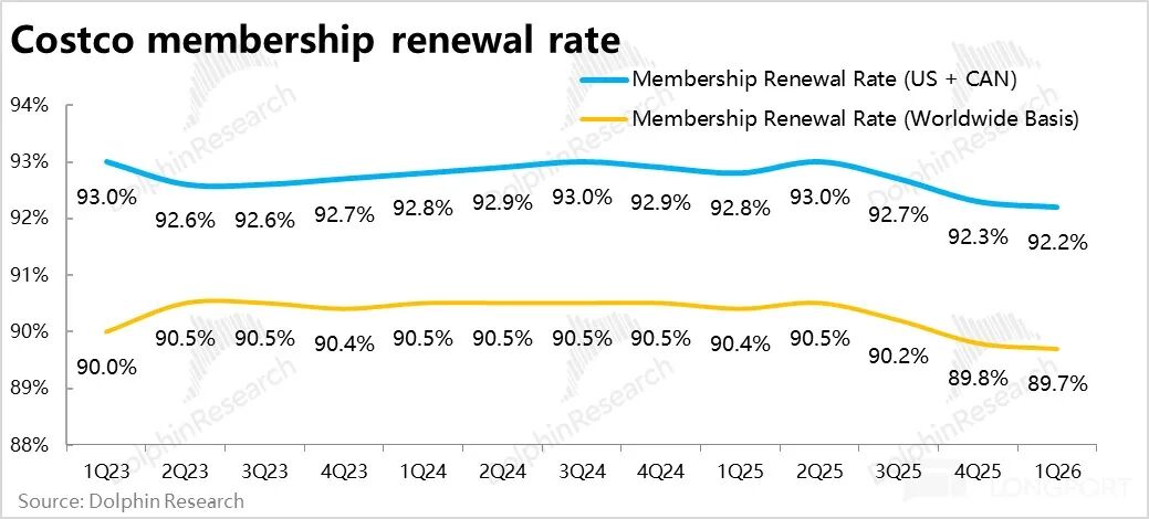 结合公司先前的解释,续费率持续下滑(以及本次反映出的普通会员净减少),主要是疫情后,Costco 通过线上渠道或者折扣渠道,拓展了大量的新用户。然而这部分用户中,有一部分未必适配 Costco 的模式,可能只是 “尝鲜或贪便宜”,且在会员有效期内没有被成功转化为忠诚用户,因此被清洗出去也并不意外。