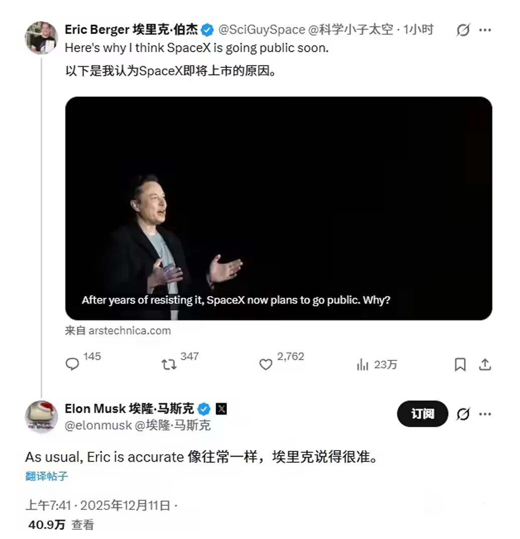 12月11日,马斯克在社交平台X上点赞了资深太空作家埃里克·伯格(Eric Berger)关于SpaceX上市的文章,并且评论“像往常一样,埃里克是对的”。