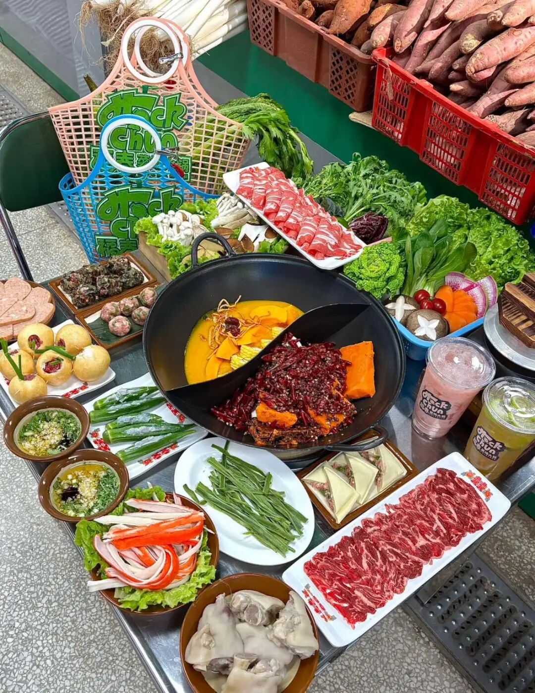 除了商超之外,通过新鲜食材概念去卷市场的火锅店,也在全国如雨后春笋般崛起。一类是菜市场火锅,如今在火锅最内卷的川渝地区,菜市场火锅不断在社交平台上走红,其模式通常是用户可以去菜市场自行购买食材,煮上门店师傅现炒的火锅底料。