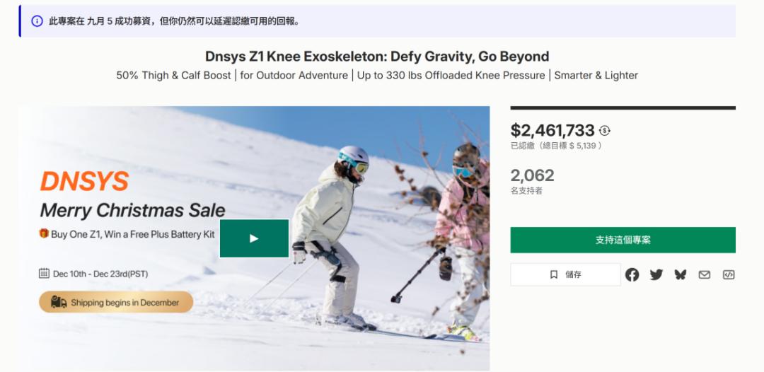 北京动思创新科技则是另辟蹊径,旗下产品“Dnsys Z1”为世界首创膝关节外骨骼,该产品在今年9月成功完成众筹,支持人数达到1959人。在完成众筹后,支持人数仍在继续增长,截至12月10日已增加至2062人,众筹金额为246.17万美元,单关节起售价为699美元,双关节版为949美元。