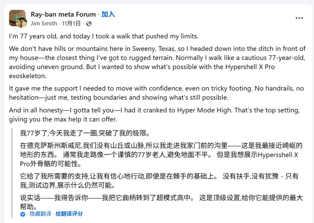 尽管Hypershell更加关注户外运动人群,但依旧有不少老人选择购买使用。在Facebook上,有子女或是孙辈拍摄视频分享给家中老人使用的状况,更有老人自发的分享起使用感受。
