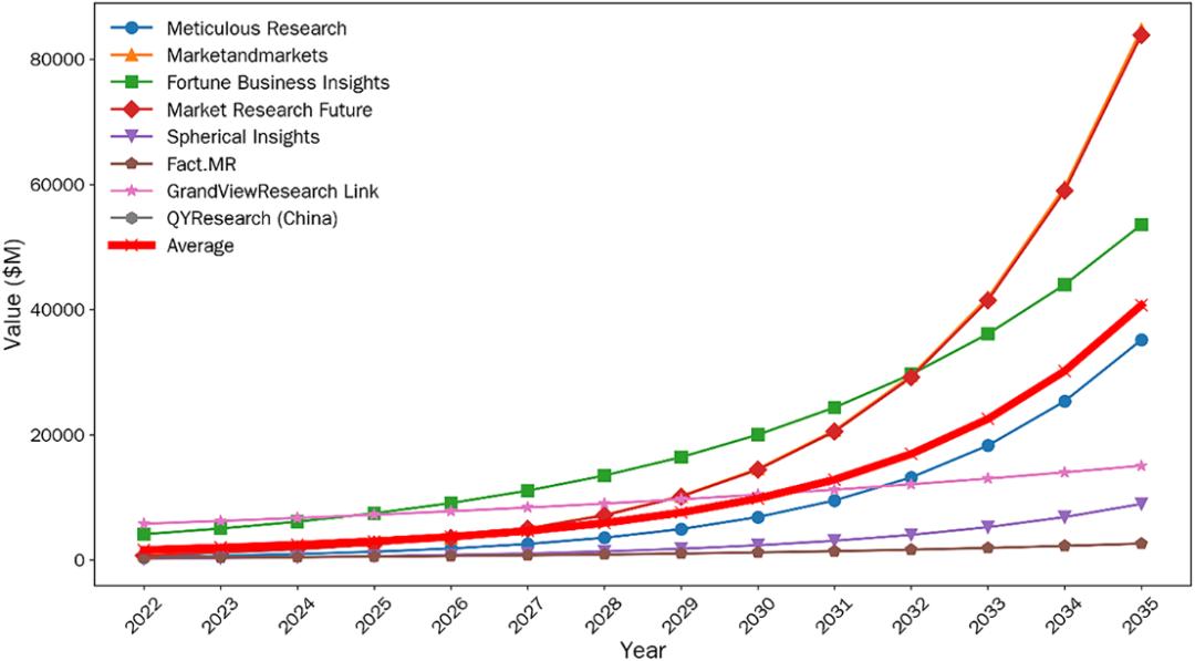 一些机构对于外骨骼赛道的增长极为乐观。最为乐观的预测认为该市场复合年增长率可达42.2%,而较为谨慎的预测则为7.6%。经过德尔菲法综合测算,行业平均复合年增长率约为28%,预计整体市场规模将从2022年的16亿美元增至2035年的400亿美元。