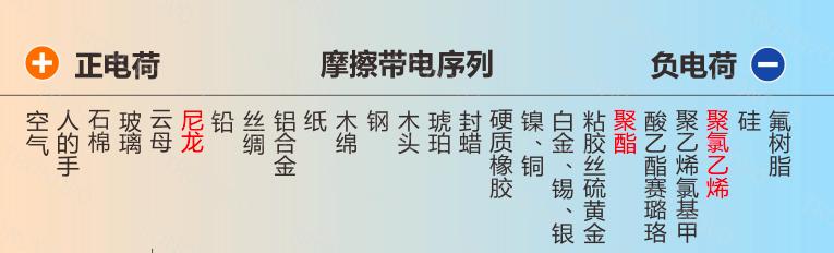 这就得提到一个榜单,摩擦起电序列。排在前面的更容易丢电子,排在后面的更容易抢电子。