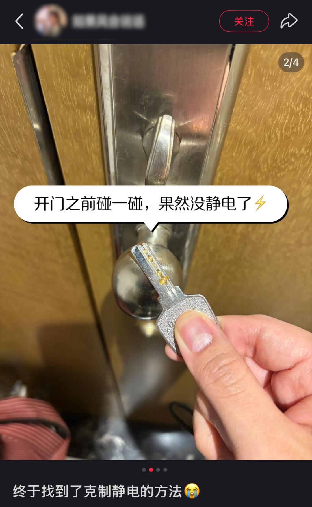 实在不想摸墙,拿钥匙怼门把手也行(注意钥匙原本就在口袋里)。