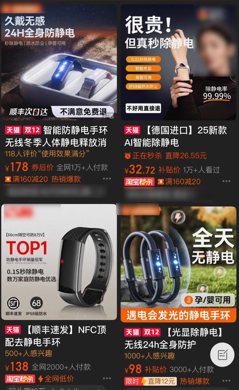 除了网友的邪修招数,电商平台也会出现一堆千奇百怪的抗静电产品,什么手环啊、喷雾啊。