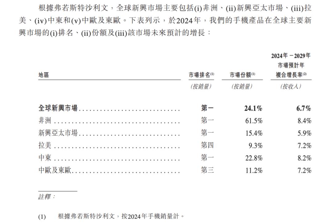 弗若斯特沙利文报告2024年全球新兴市场份额及排名,注:新兴亚太市场包括南亚、东南亚市场等,图源 / 传音招股书
