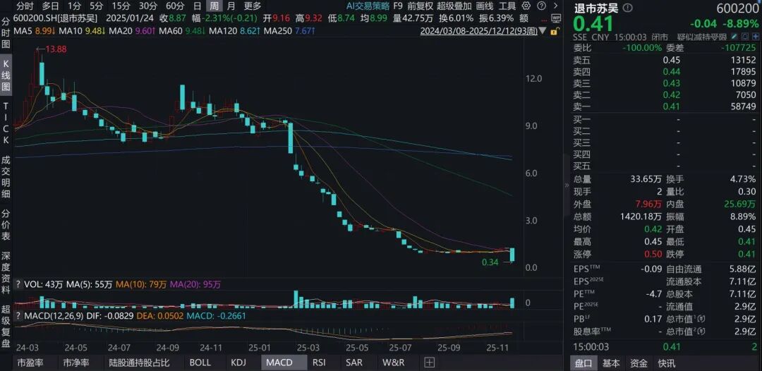 因连续多年财务造假被勒令退市的江苏吴中股票于2025年12月9日进入退市整理期。截至发稿,留给中小股东决定去留的时间仅剩11个交易日。从12月9日开盘到现在,江苏吴中股价累计下跌66.94%。