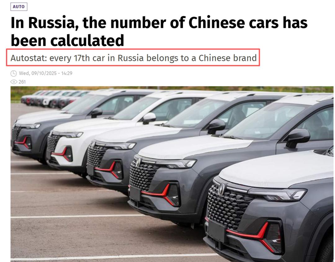 截止2025年上半年,中国品牌已在俄注册乘用车达265万辆,占俄罗斯在册乘用车总数的6%,换句话说,在俄罗斯公路上,每17辆私家车中就有1辆为中国车。