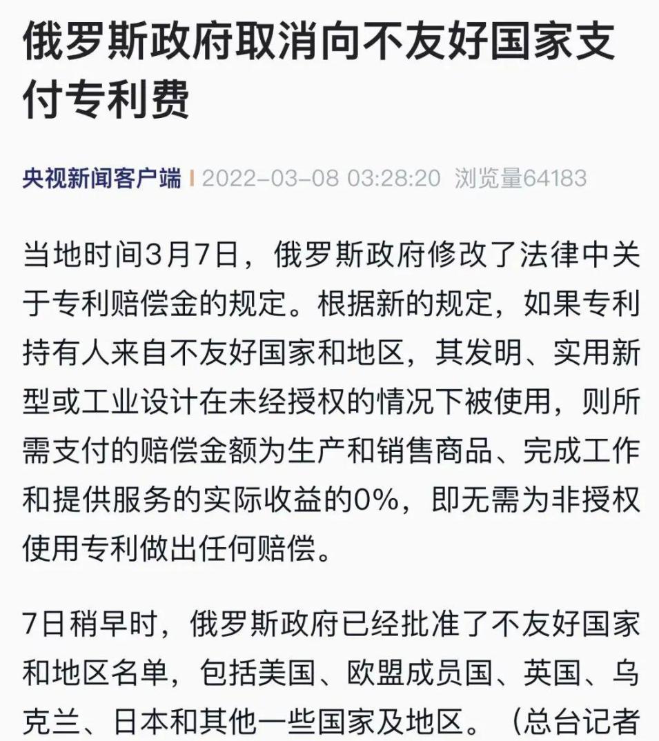 换言之,俄将不再保护一众西方国家的知识产权和专利。