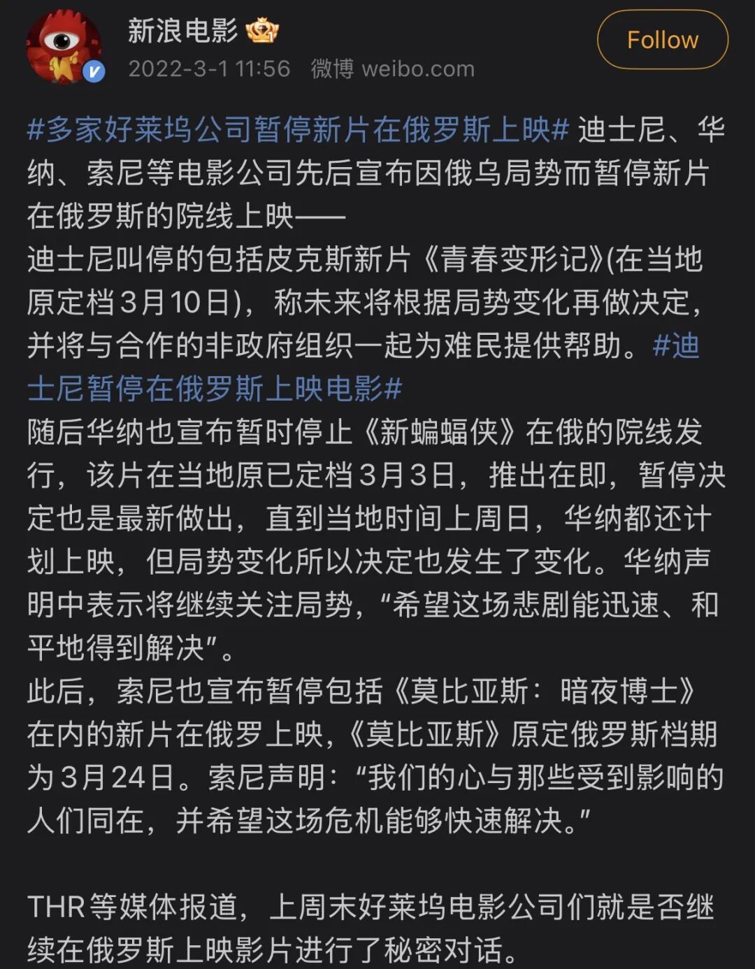 时间拨回到2022年3月,随着俄乌冲突的加剧,一众好莱坞制片厂选择从俄罗斯电影市场大撤退,其中最先跑路的就是迪士尼,后续所有相关的电影发行全部暂停,时至今日,几大制片厂依旧没有恢复上映计划。