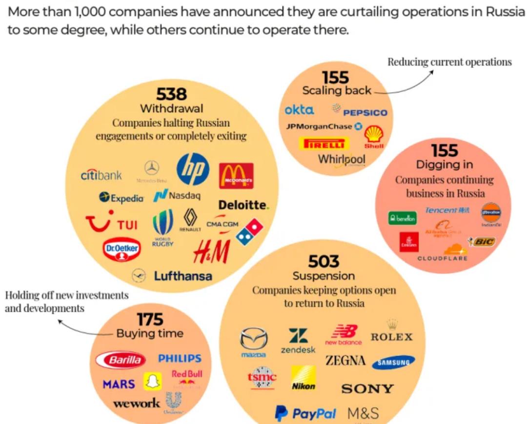 当初俄罗斯遭到了西方诸国的全方位制裁,资产该冻冻,公司该撤撤,包括许多国际知名品牌在内的近1400家公司宣布将停止或缩减在俄罗斯的业务,甚至连国际支付体系都给踢出去了。
