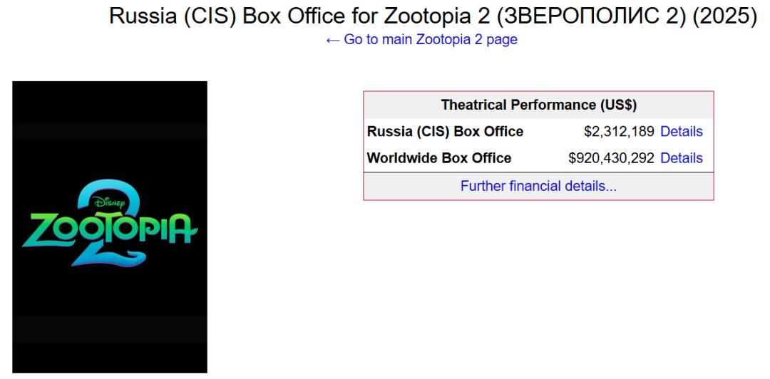 2016年上映的首部《疯狂动物城》,在俄罗斯取得了3915万美元的票房佳绩,被本国媒体誉为“最成功的外国动画片”之一,打了相当广的观众基础。