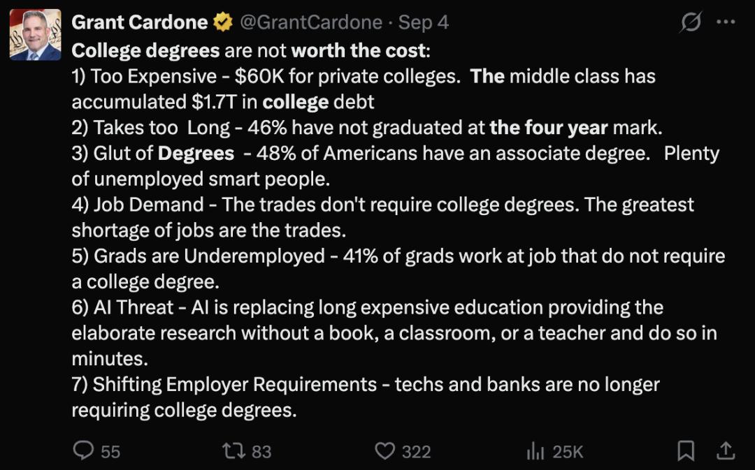 网友Grant Cardone更是总结了四年制大学学费不值的「七宗罪」: