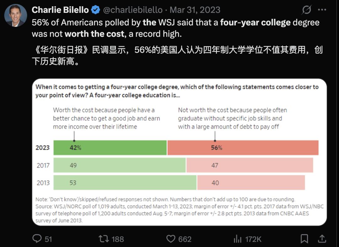 还有网友贴出了2023年《华尔街日报》的民调结果,约56%的被调查者认为四年制大学学位不值其费用。