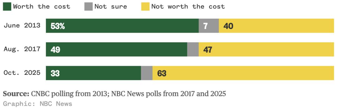 民主党人的变化也很大,但幅度较共和党人更小:2013年有61%的人认为值得,今年是47%。