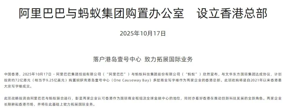10月,阿里和蚂蚁联合豪掷72亿港元,购入铜锣湾港岛壹号中心13层写字楼,计划在此设立双总部。