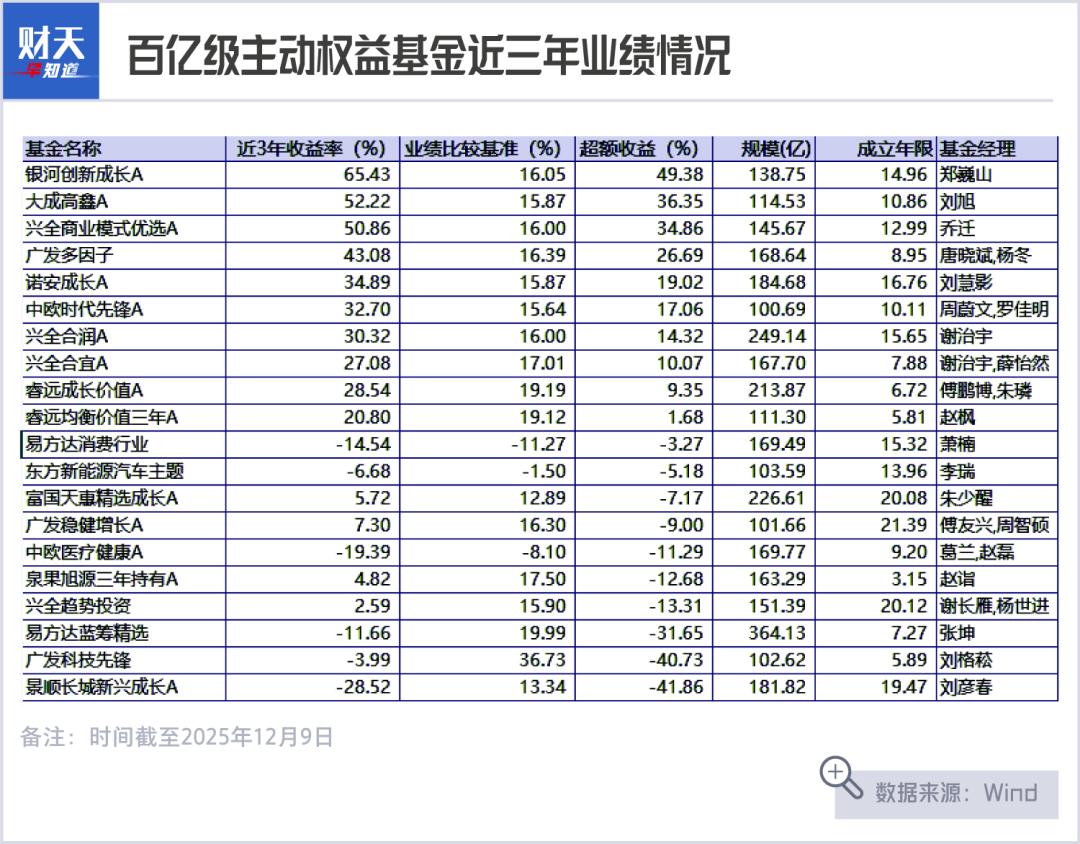 根据Wind数据,在20只主动权益类百亿级基金中,近三年(截至12月9日),跑赢比较基准超10%的共有8只,跑输业绩比较基准超10%的共有6只。