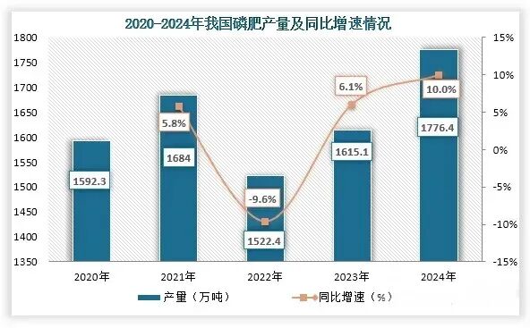 2020-2024年我国磷肥产量及同比增速情况 来源:观研报告网